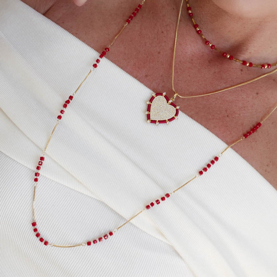 Descrição: Colar longo com cristais em tom vermelho cereja