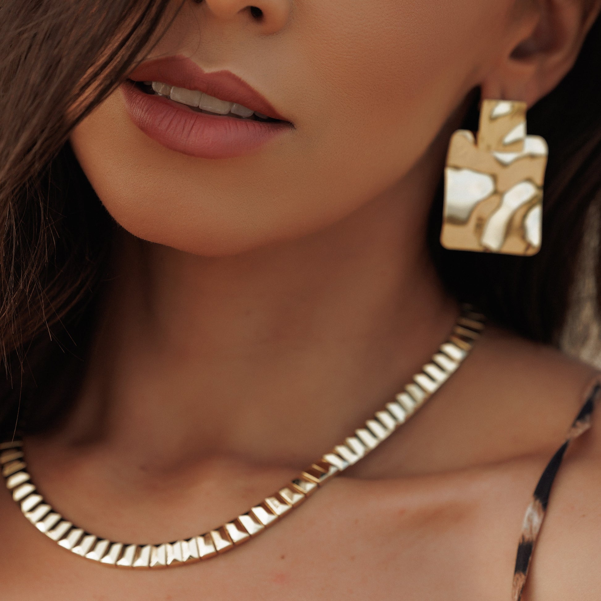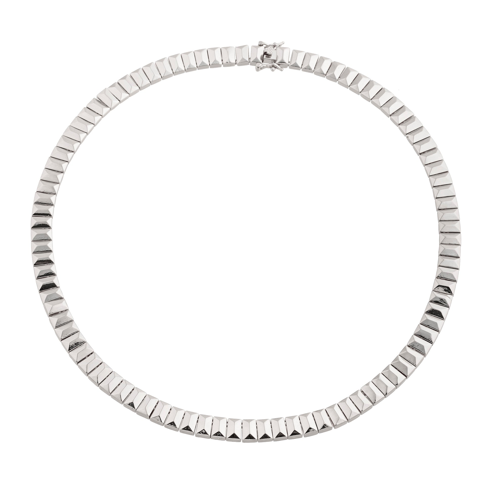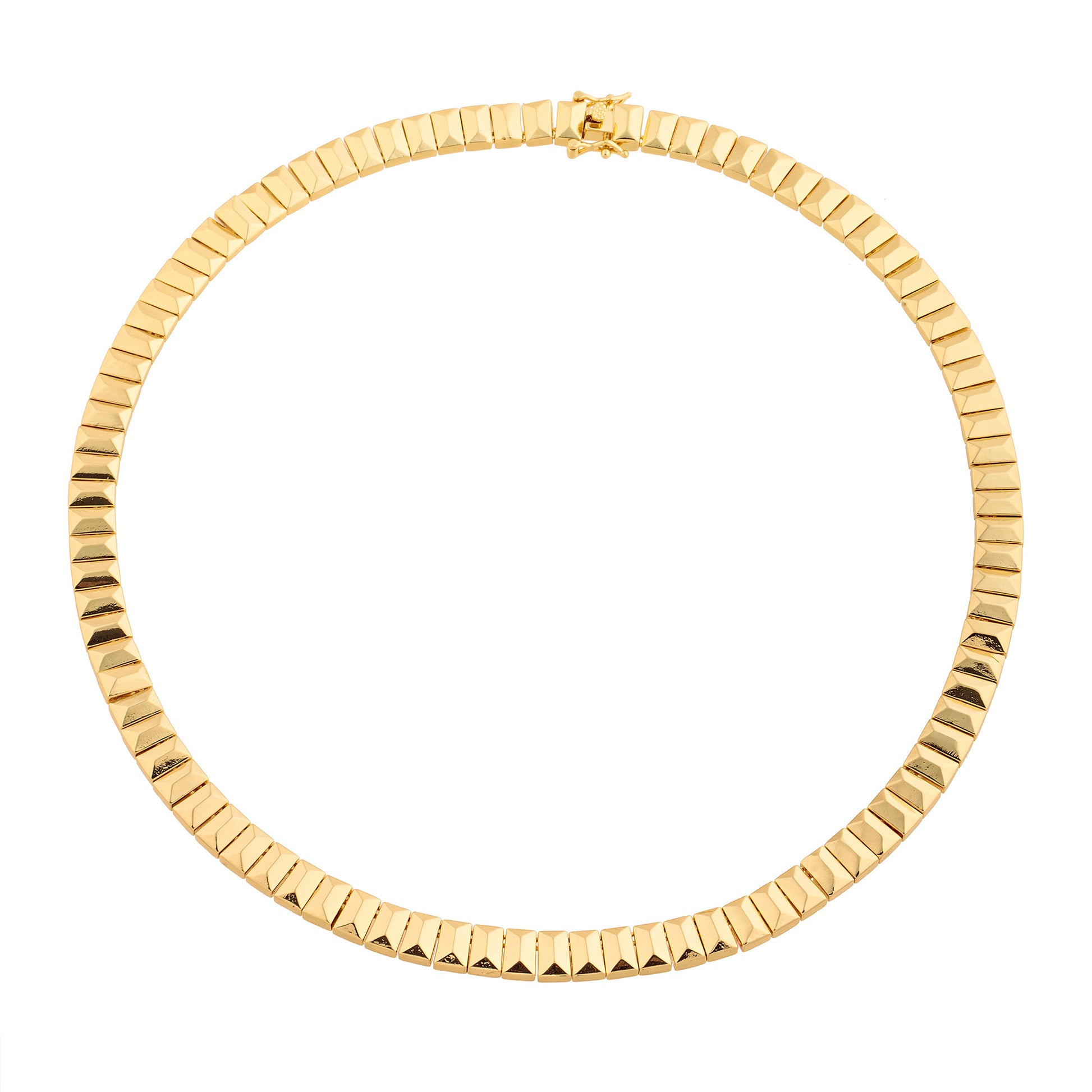 Descrição: Colar articulado em formato retangular liso, possuí fecho gaveta.