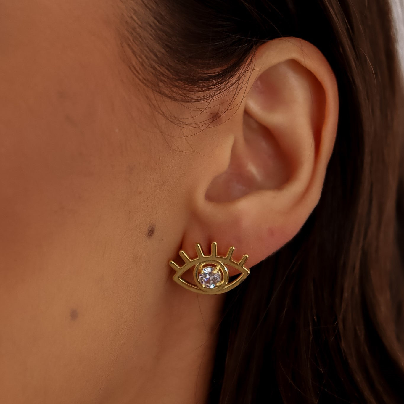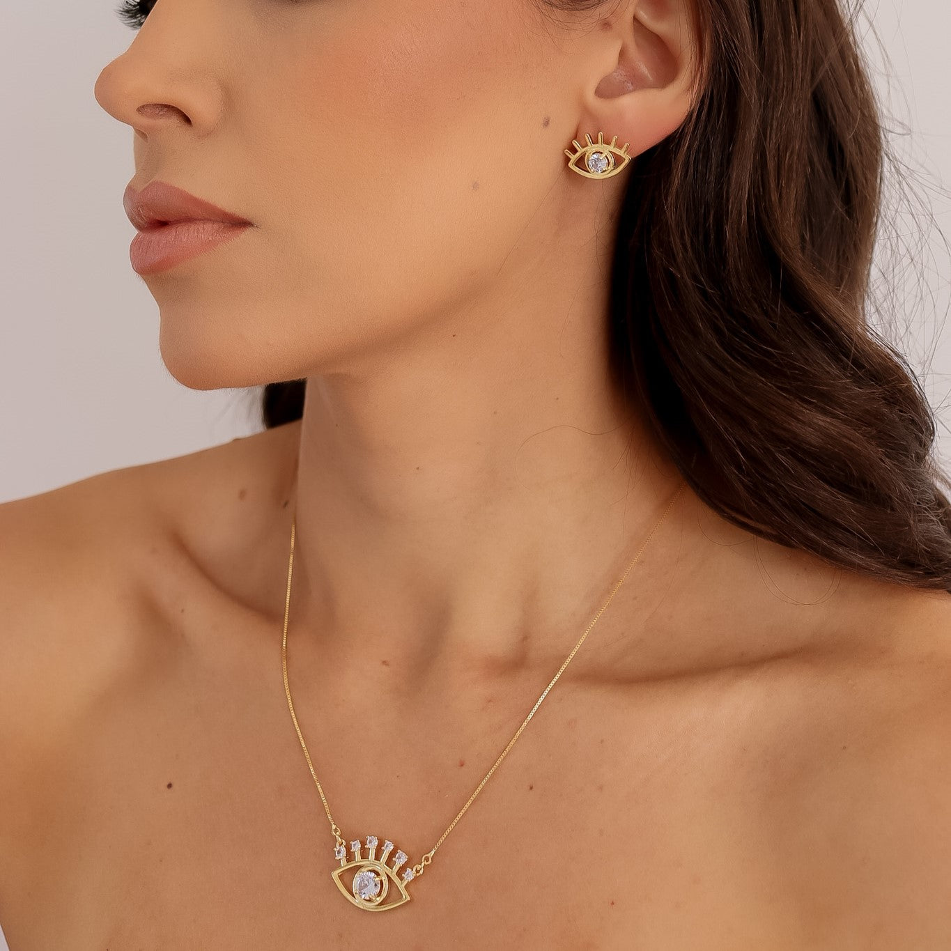 Descrição: Conjunto composto de colar e brinco em formato de olho grego, cravejado em pedra azul safira com zircônia colorida/ ou cravejado em zircônia cristal