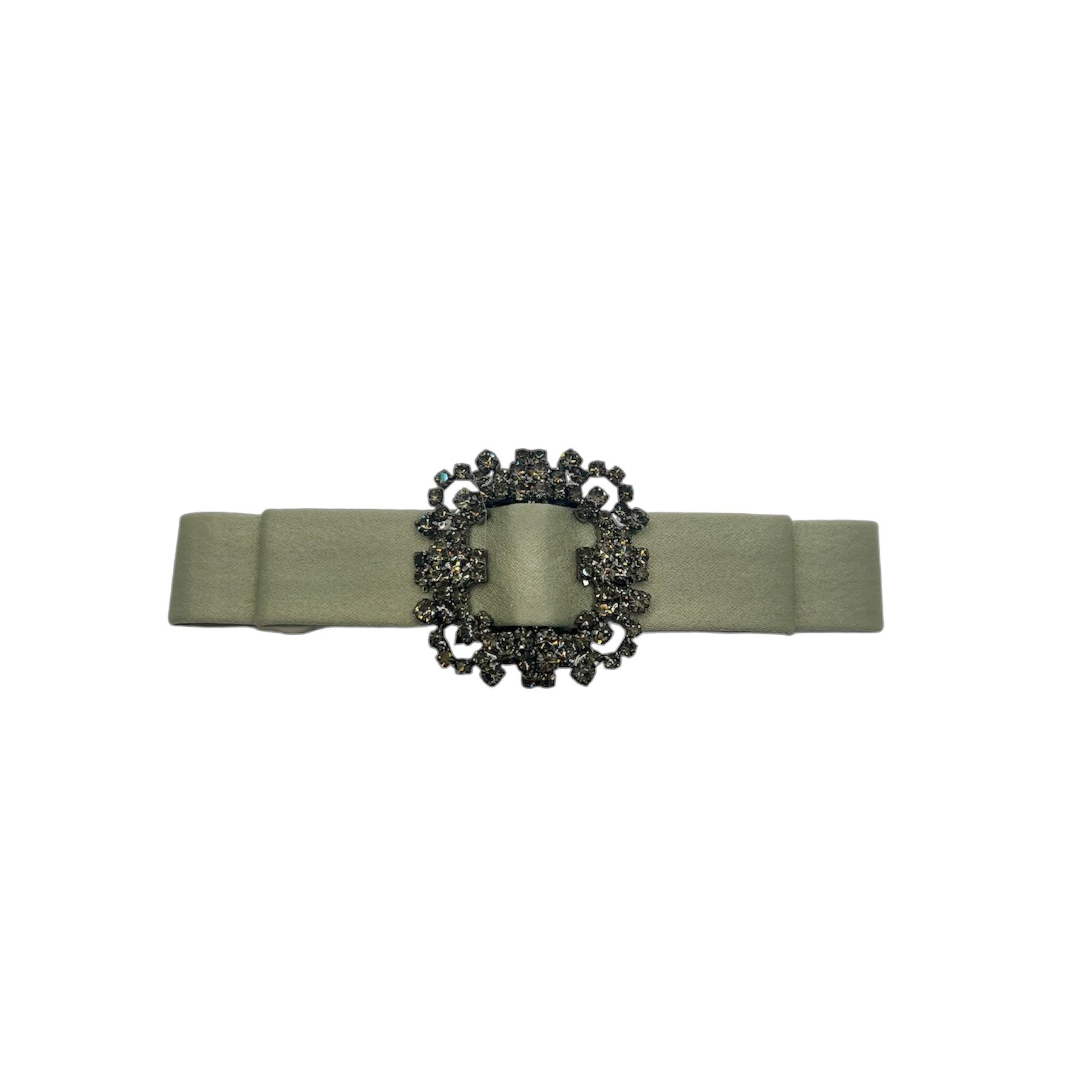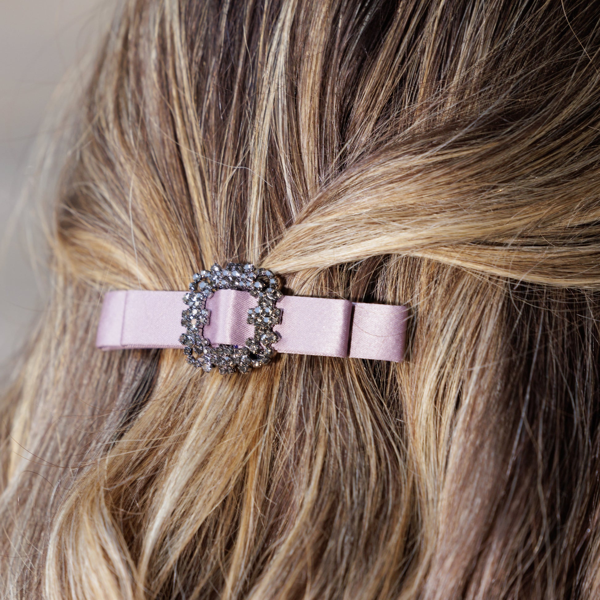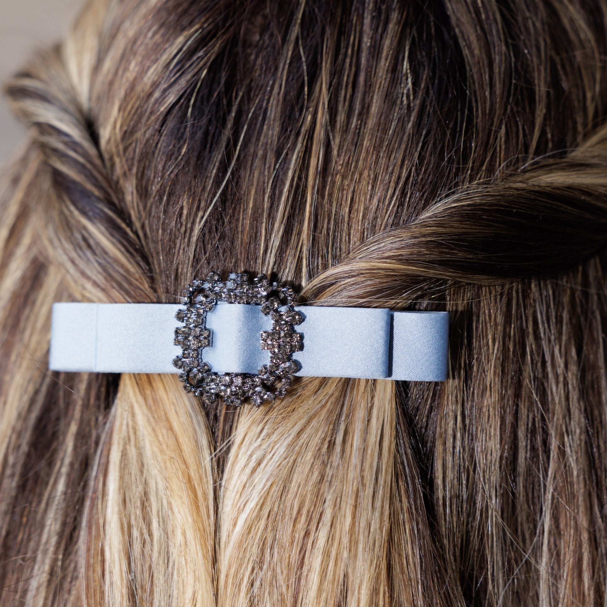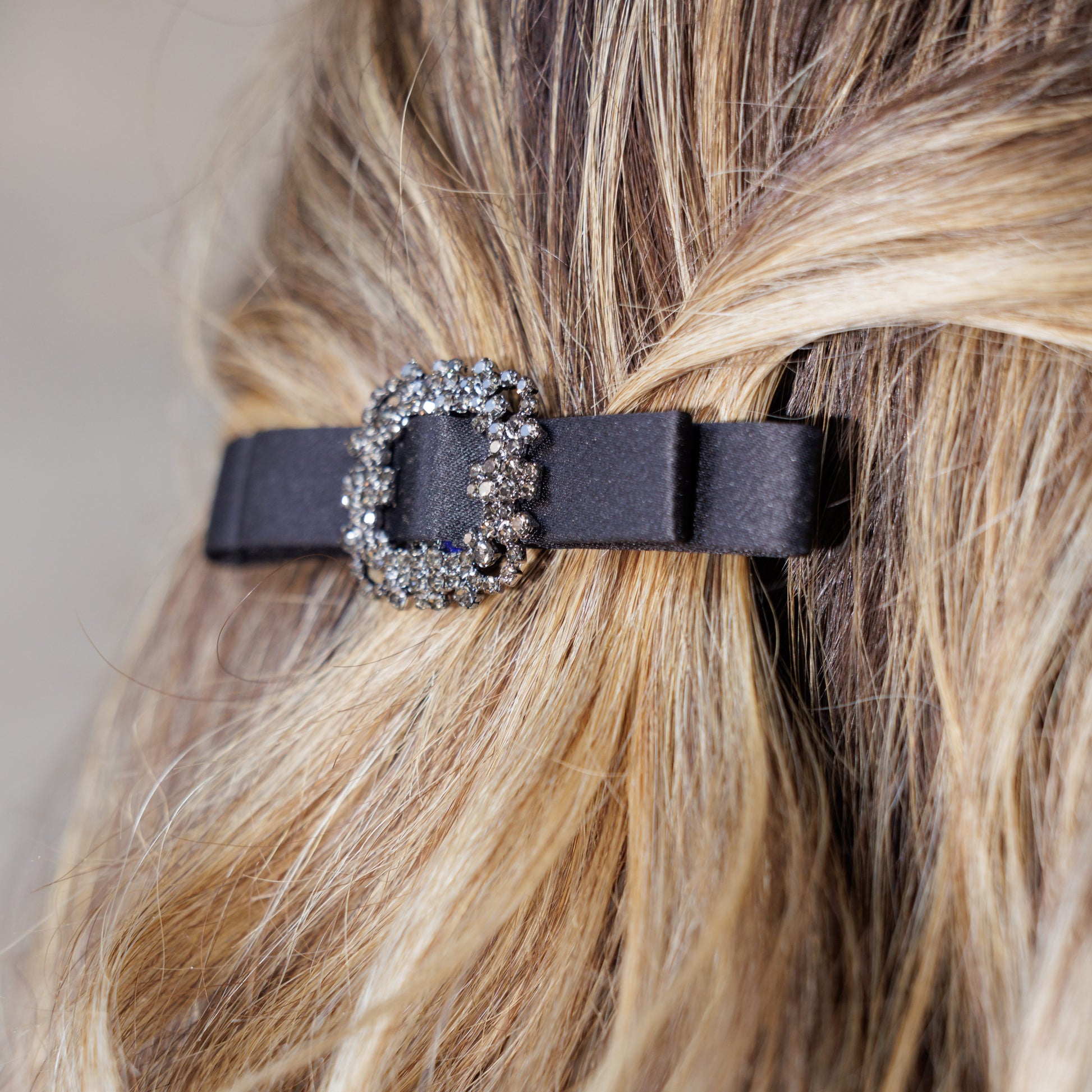 Descrição: grampo de cabelo com fecho click, confeccionado em tecido, super estruturado com aplicação de peça em ródio negro