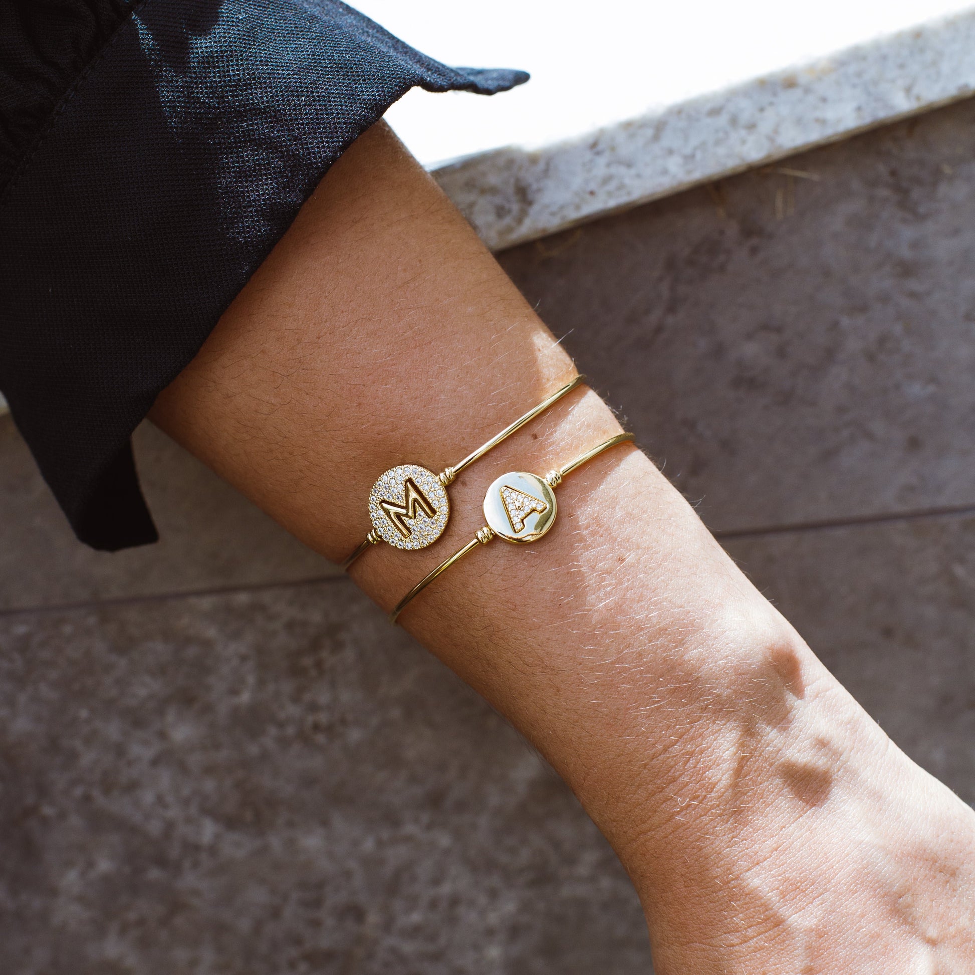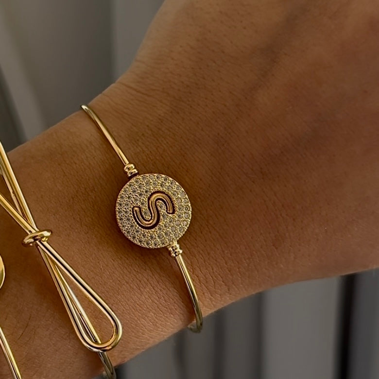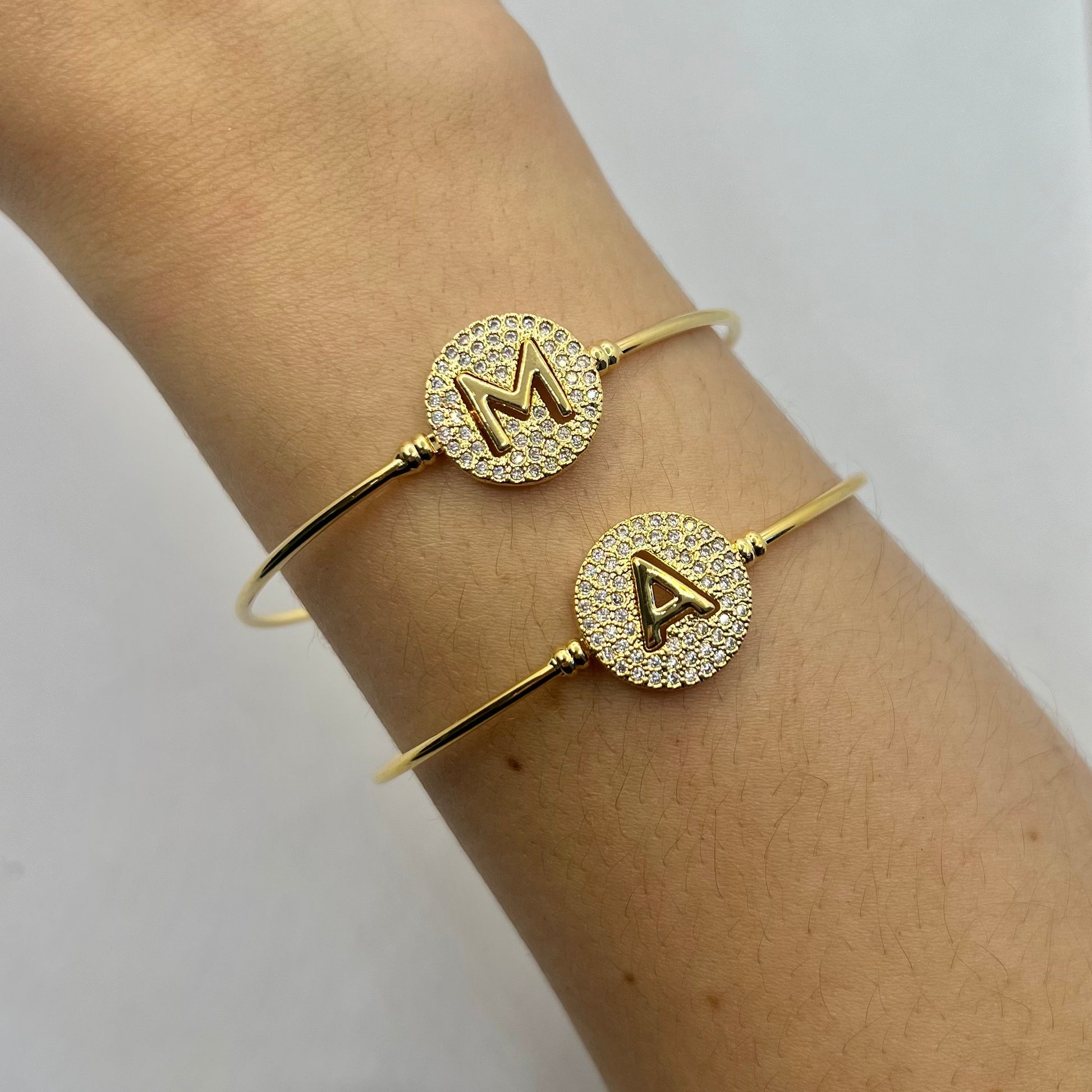 Pulseira Bracelete Entorno Cravejado e Inicial Lisa Dourado