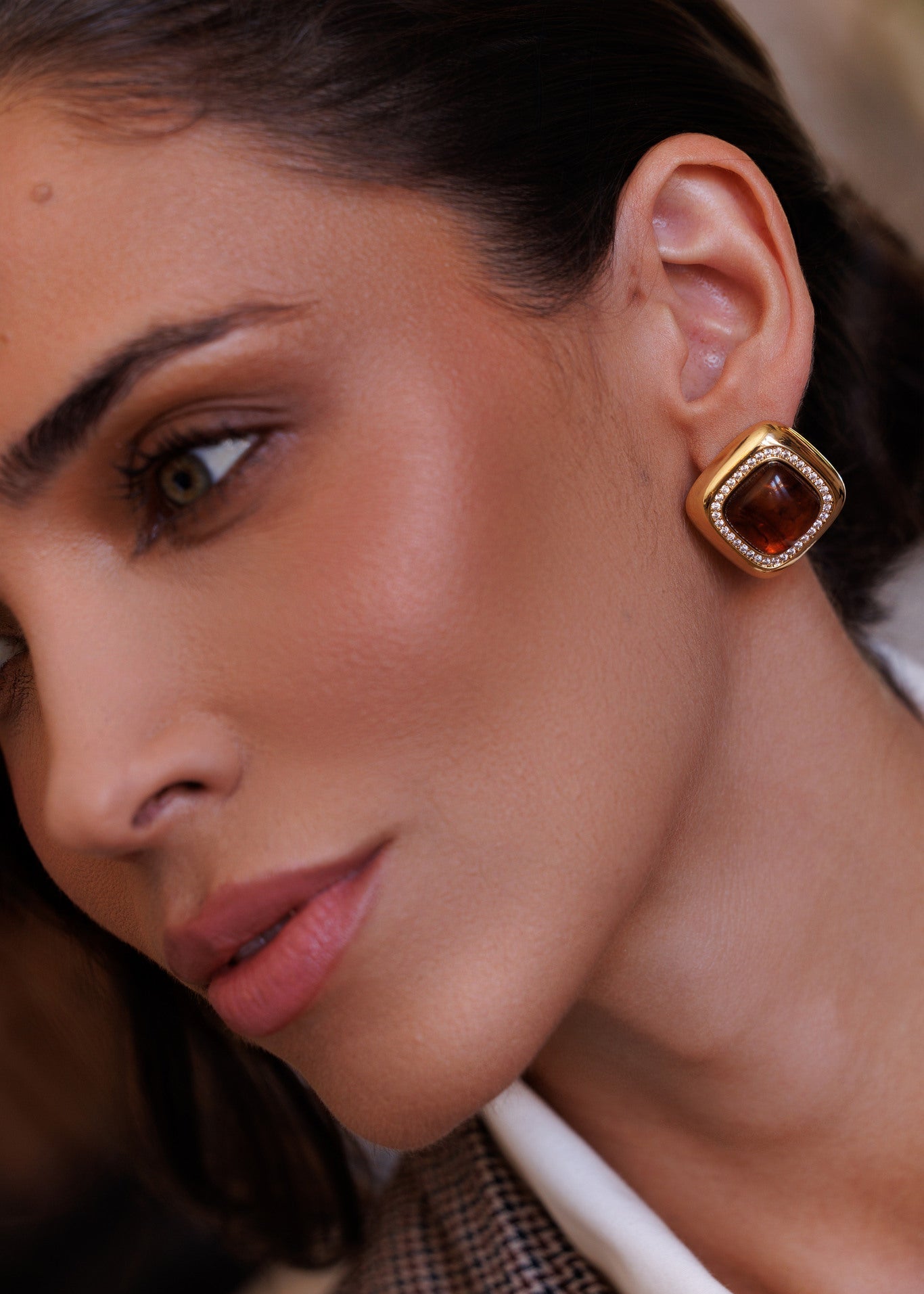 O Brinco Quadrado com Pedra Pequeno traz proporção compacta com aplicação central em resina e moldura dourada texturizada. A estrutura definida cria um contorno elegante, enquanto a pedra adiciona profundidade e ponto de cor na medida certa.