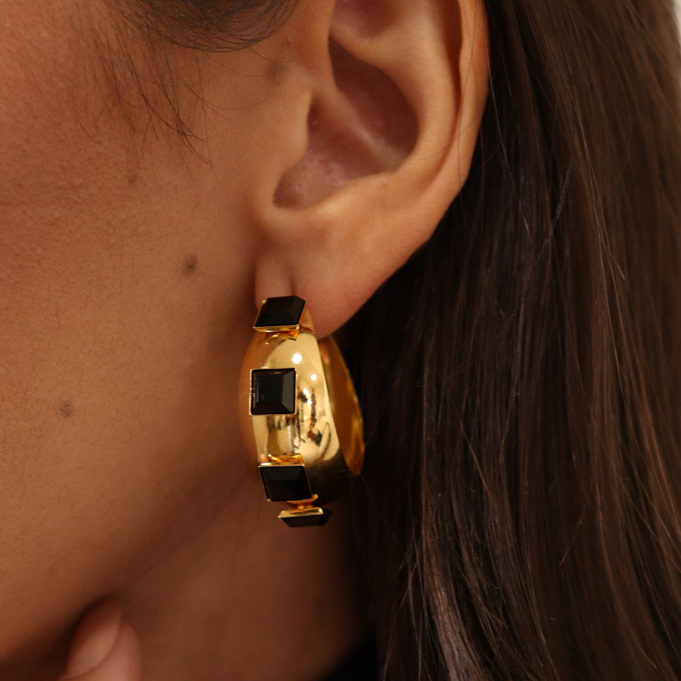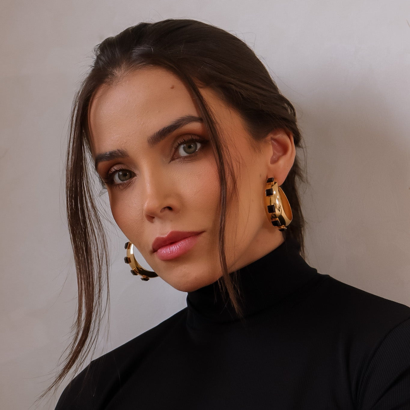 O Brinco Argola Dourada com Quadrados Pretos é a peça perfeita para quem busca estilo moderno e ousado em um único acessório. Seu design robusto em argola larga ganha destaque com aplicações em formato quadrado na cor preta, criando um contraste elegante que valoriza qualquer produção.