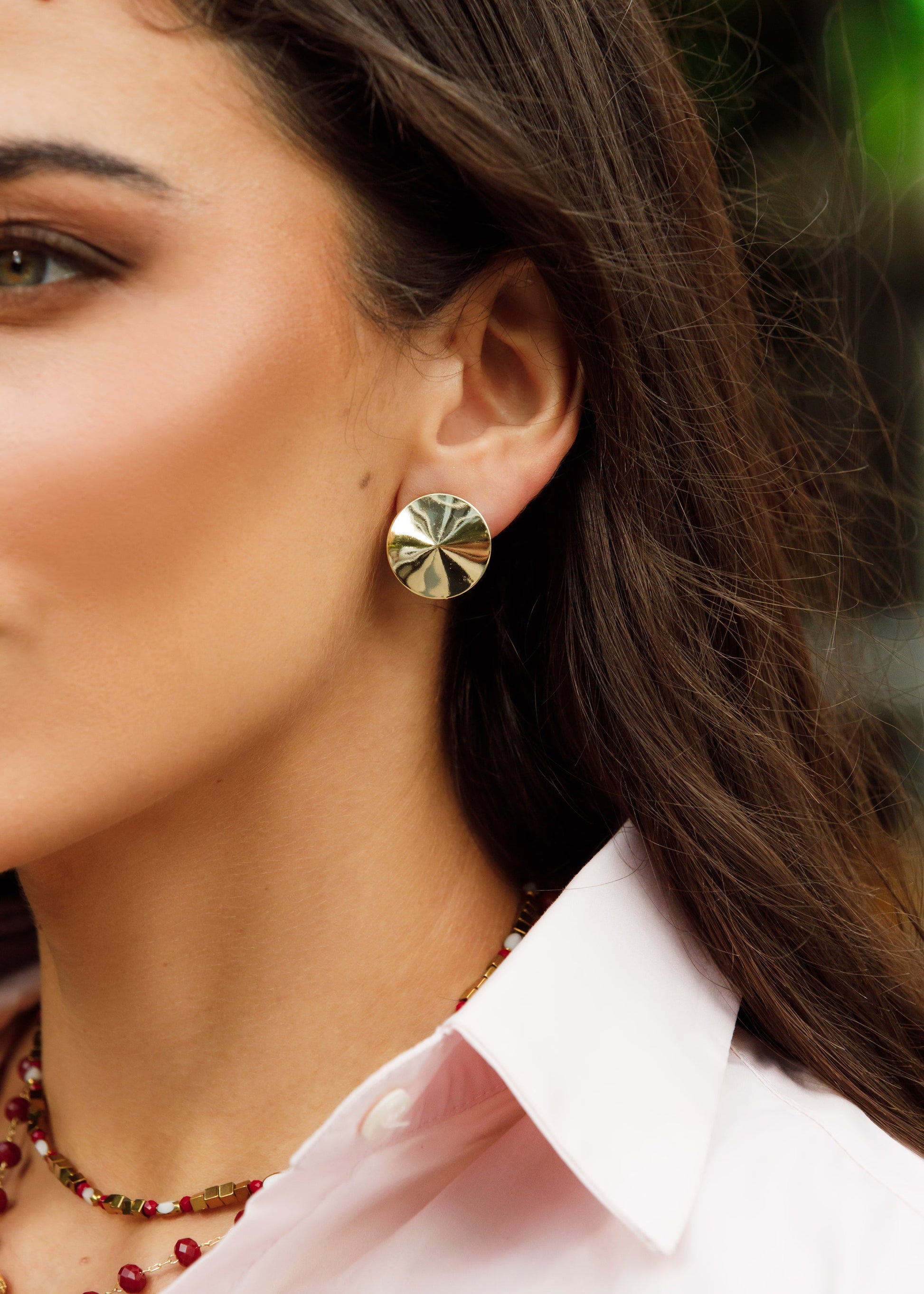 Brinco em metal com formato redondo e acabamento polido, criando reflexo suave que valoriza o visual com elegância discreta. O design clássico em botão é versátil e atemporal, ideal para composições do dia a dia ou para combinar com peças mais marcantes.