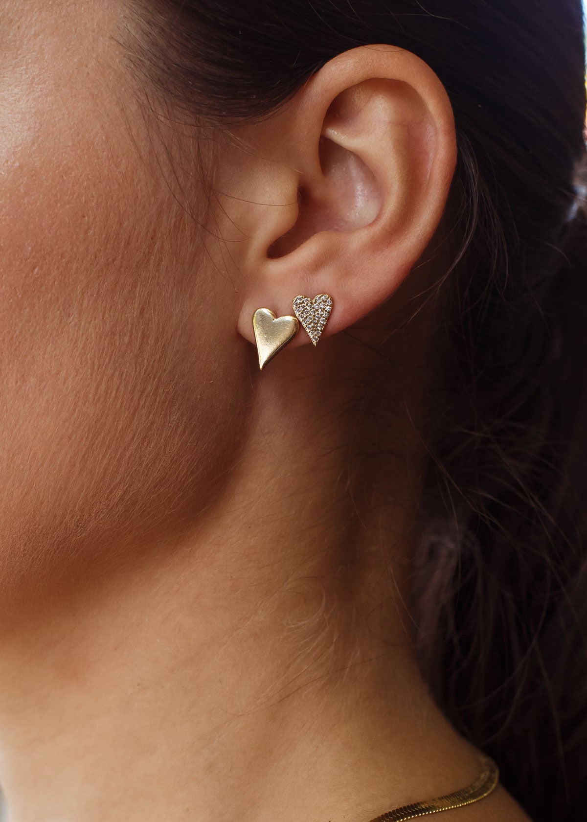 Brinco em formato de coração em composição dupla, combinando acabamento liso com detalhe cravejado. Uma proposta delicada, mas com presença, perfeita para usar sozinho ou em mix de furos.