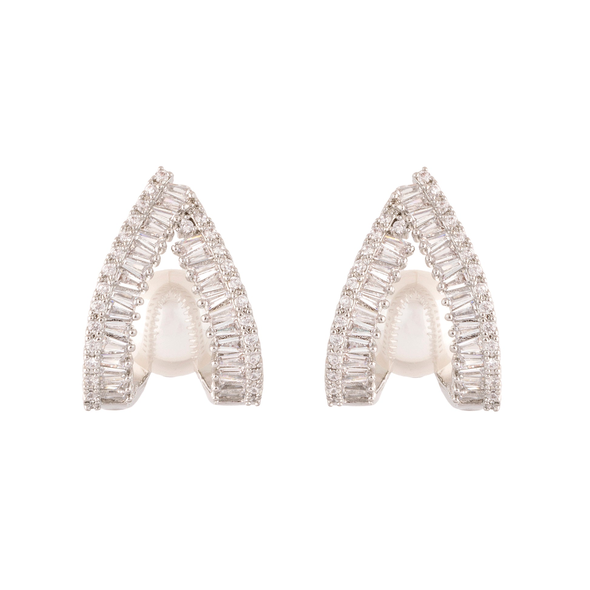 Descrição: Brinco em formato V cravejado em zircônia cristal com aplicação de pérola