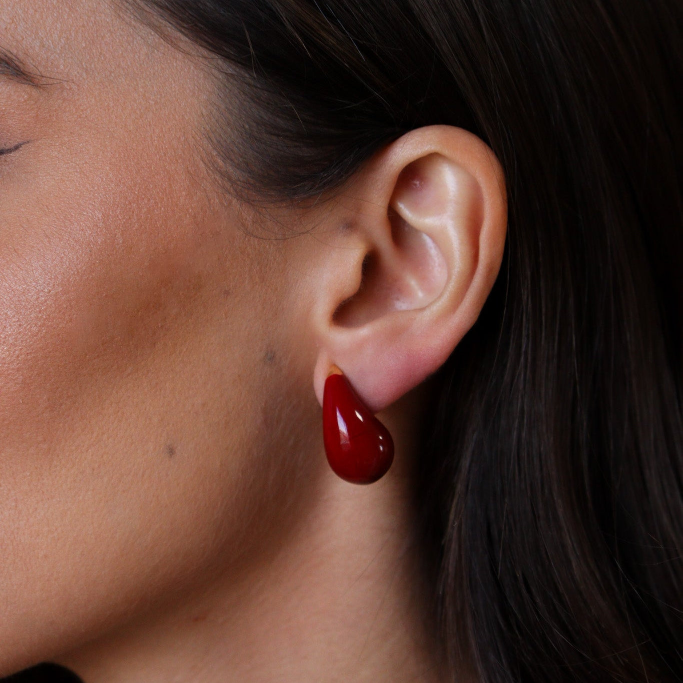 Descrição: Brinco em formato de gota esmaltada em marrom/vermelho