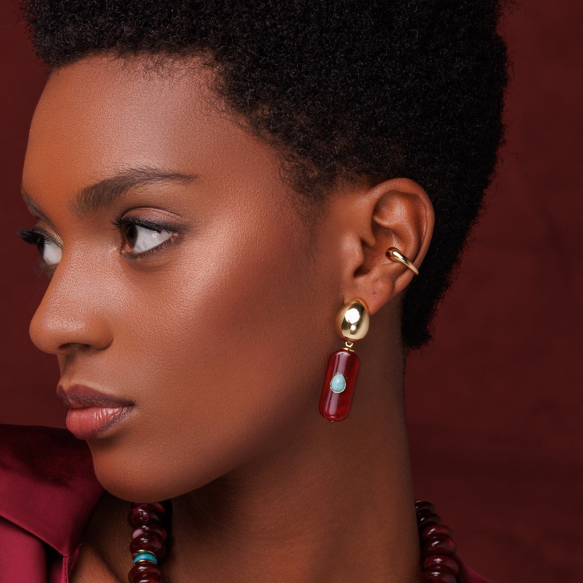 Descrição: Brinco gota lisa com aplicação de pedra em tom vermelho e gotinha em turquesa