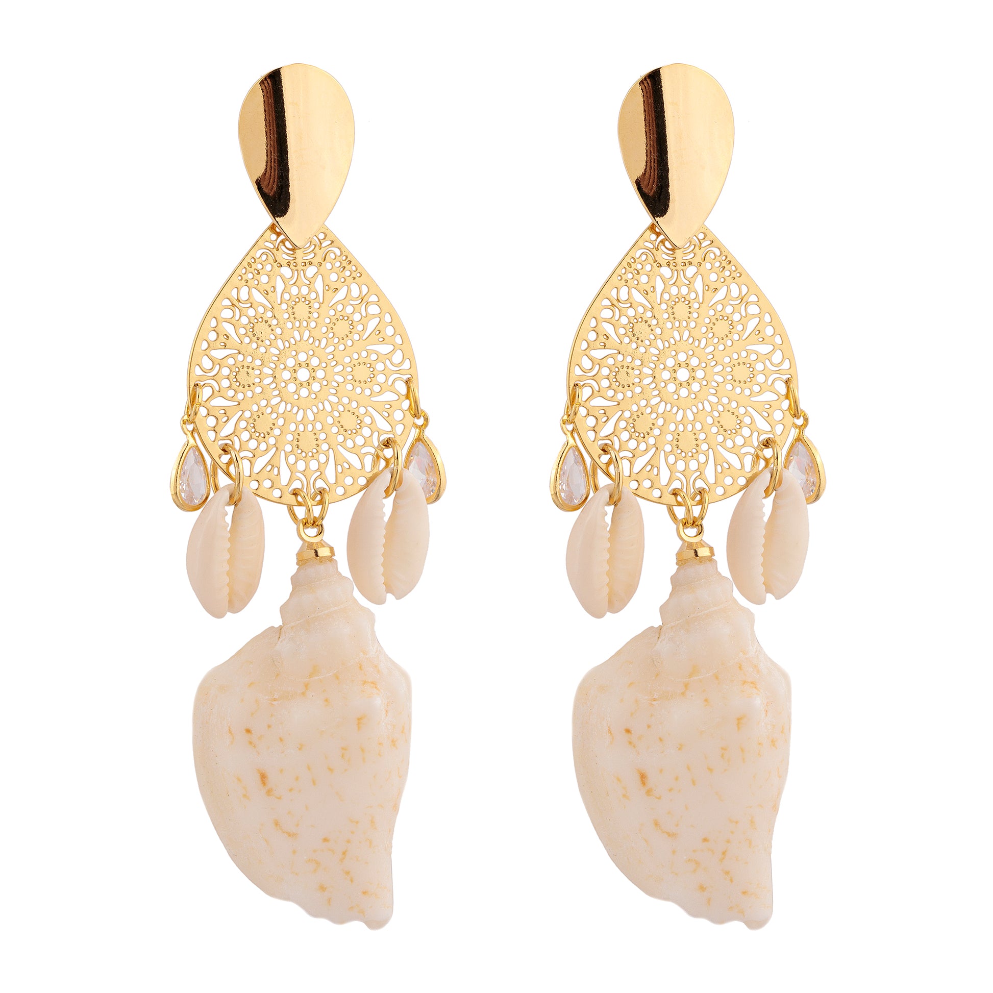 Descrição: Brinco pé gota lisa, placa trabalhada com pingentes de conchas e búzios pendurados