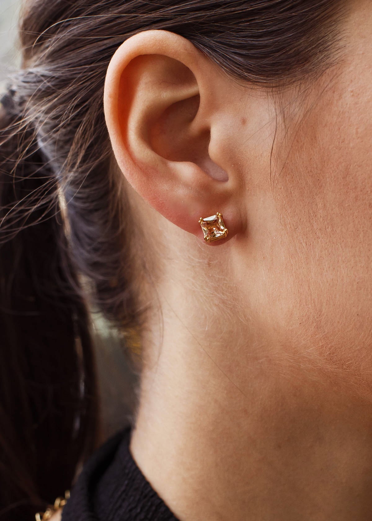 Brinco com pedra lapidada em formato quadrado, com cravação delicada e acabamento dourado. Uma peça discreta e sofisticada, ideal para o dia a dia ou para composições com outros brincos.