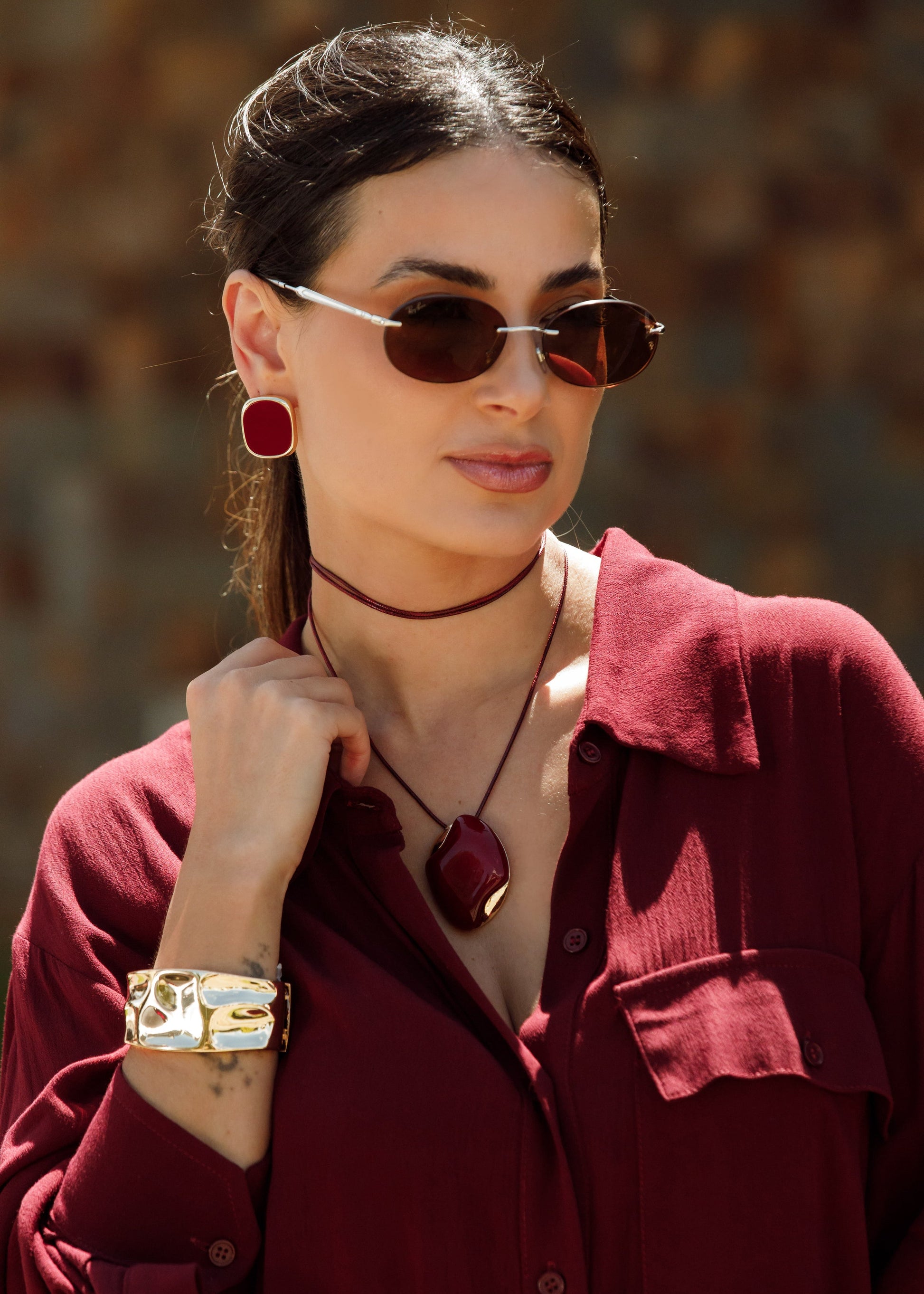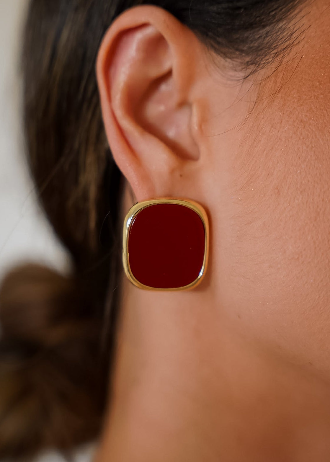 Brinco em resina com formato quadrado irregular e contorno em metal dourado, criando um contraste elegante entre o acabamento liso da peça e o brilho do metal. O desenho levemente orgânico traz um visual sofisticado, com estética contemporânea inspirada em acessórios clássicos.