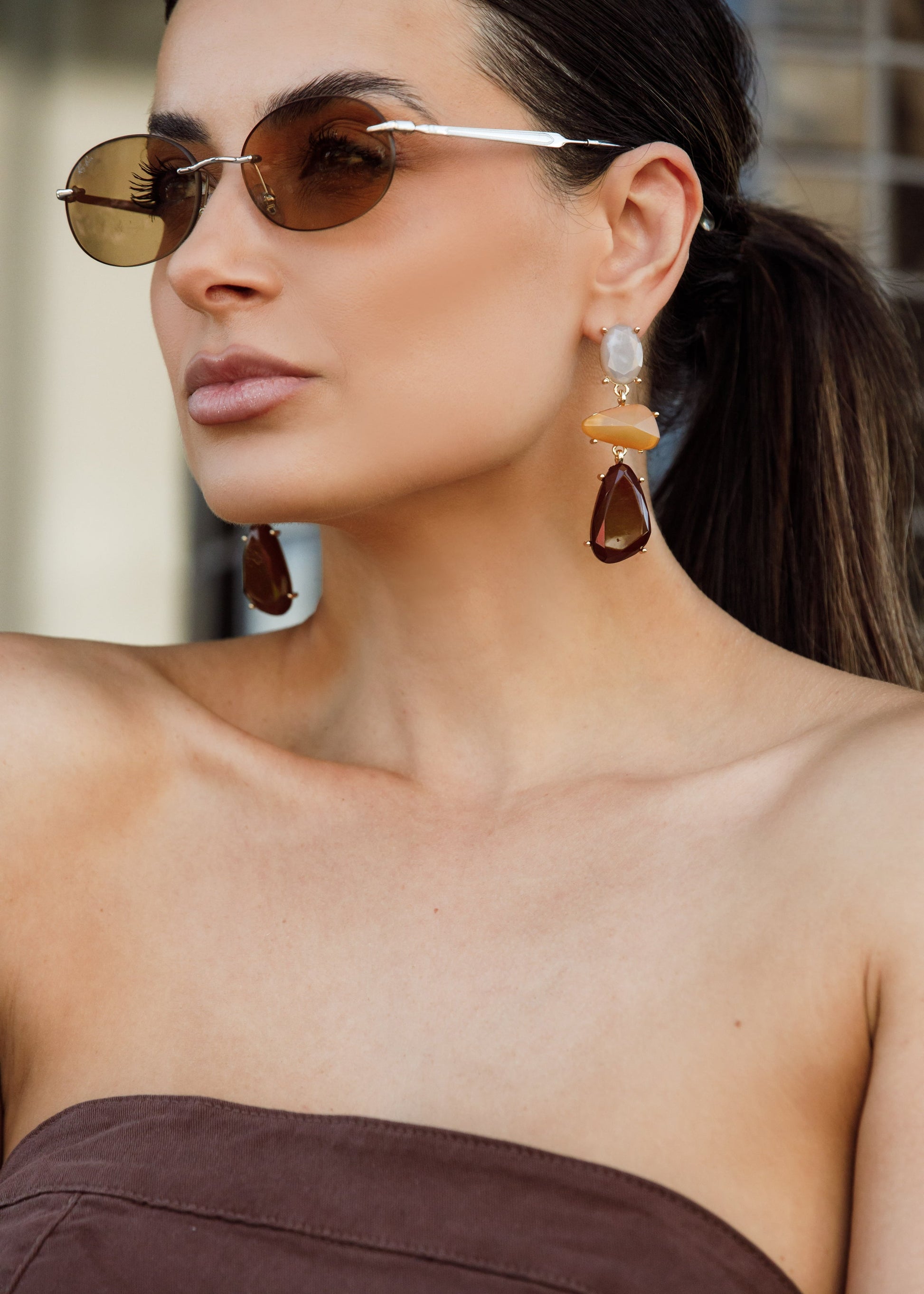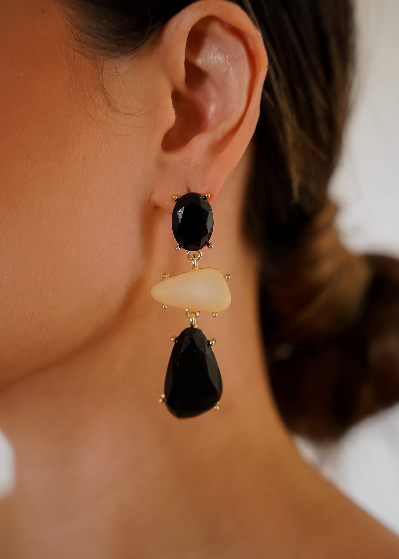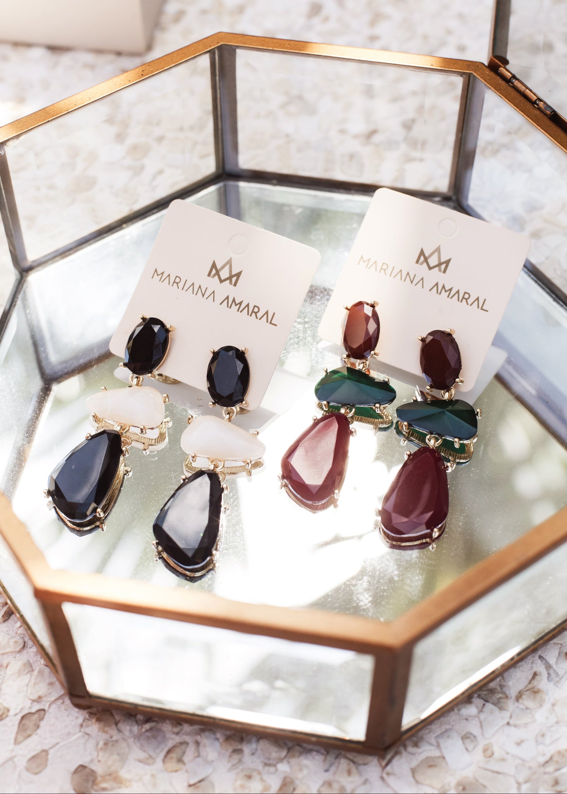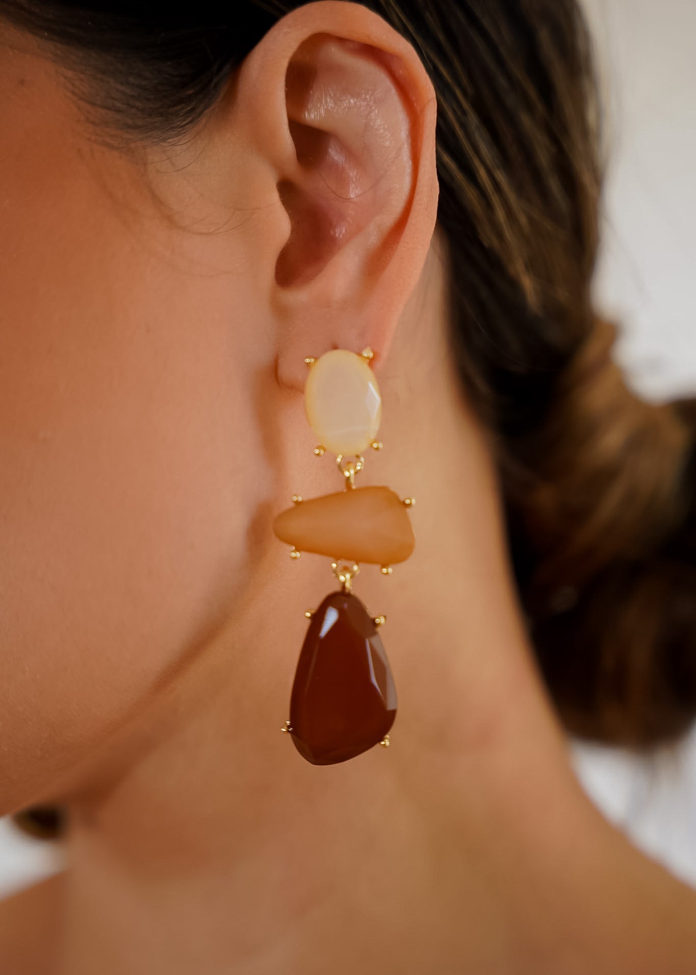 Brinco com composição de três pedras em resina com acabamento facetado, unidas por base metálica dourada. O mix de formas e cores cria movimento e profundidade, resultando em uma peça marcante, com visual sofisticado e contemporâneo.