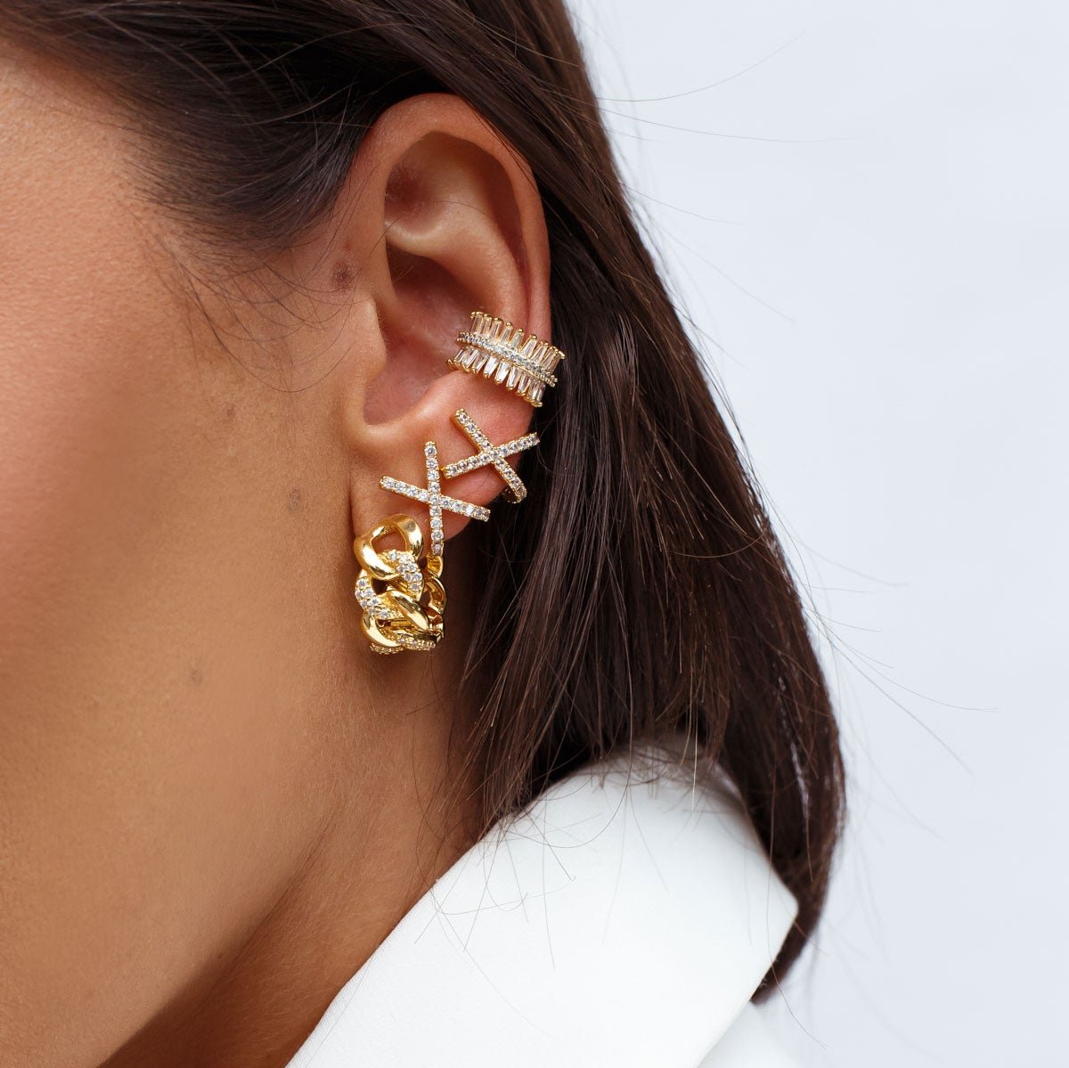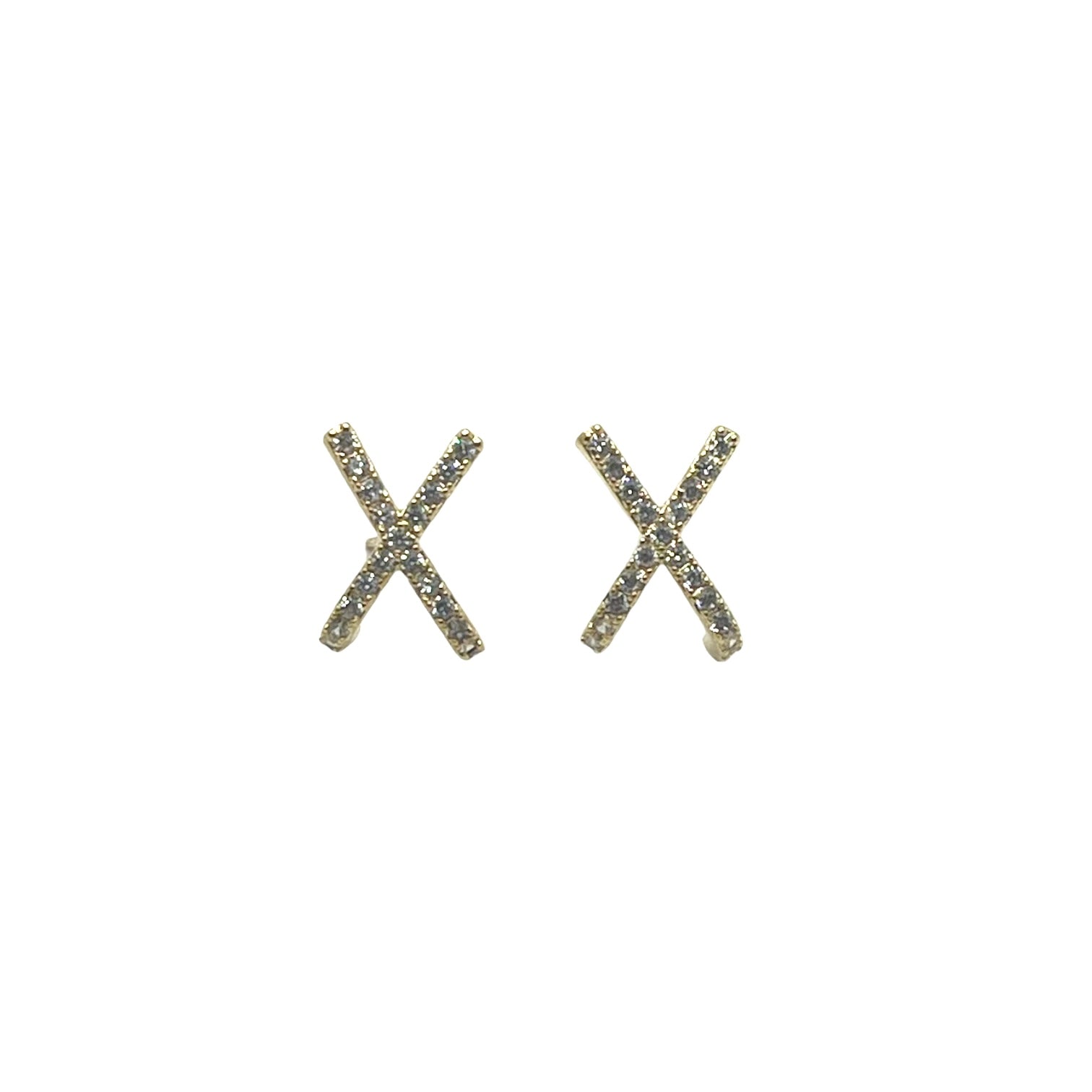 Descrição: Brinco em formato de X cravejado em zircônia cristal