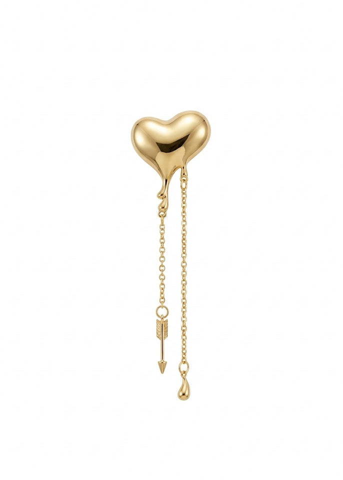 O Broche Coração com Correntes apresenta formato polido e levemente orgânico, com aplicação de duas correntes pendentes que adicionam movimento à peça. O contraste entre o volume do coração e a delicadeza das correntes cria um efeito visual marcante e contemporâneo.
