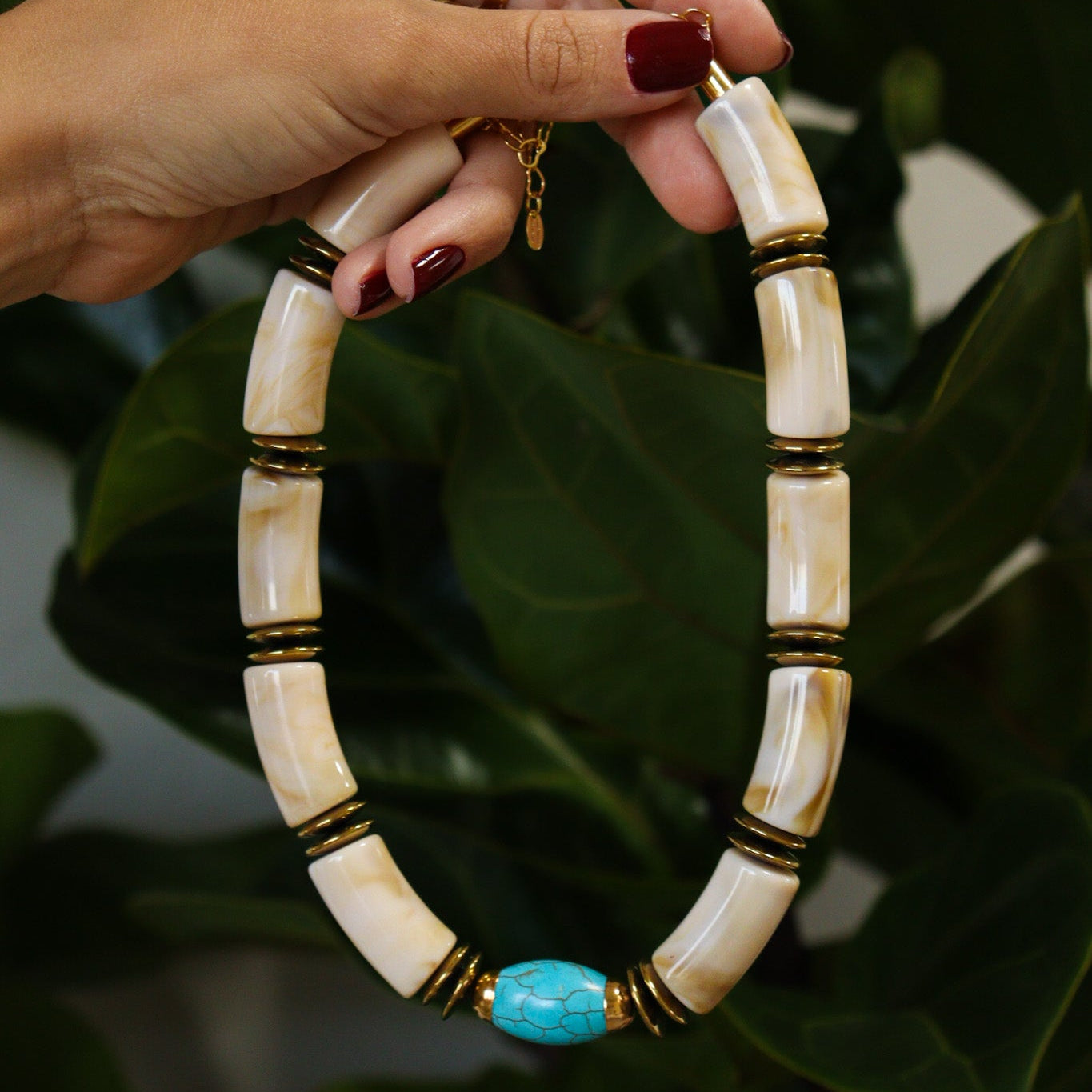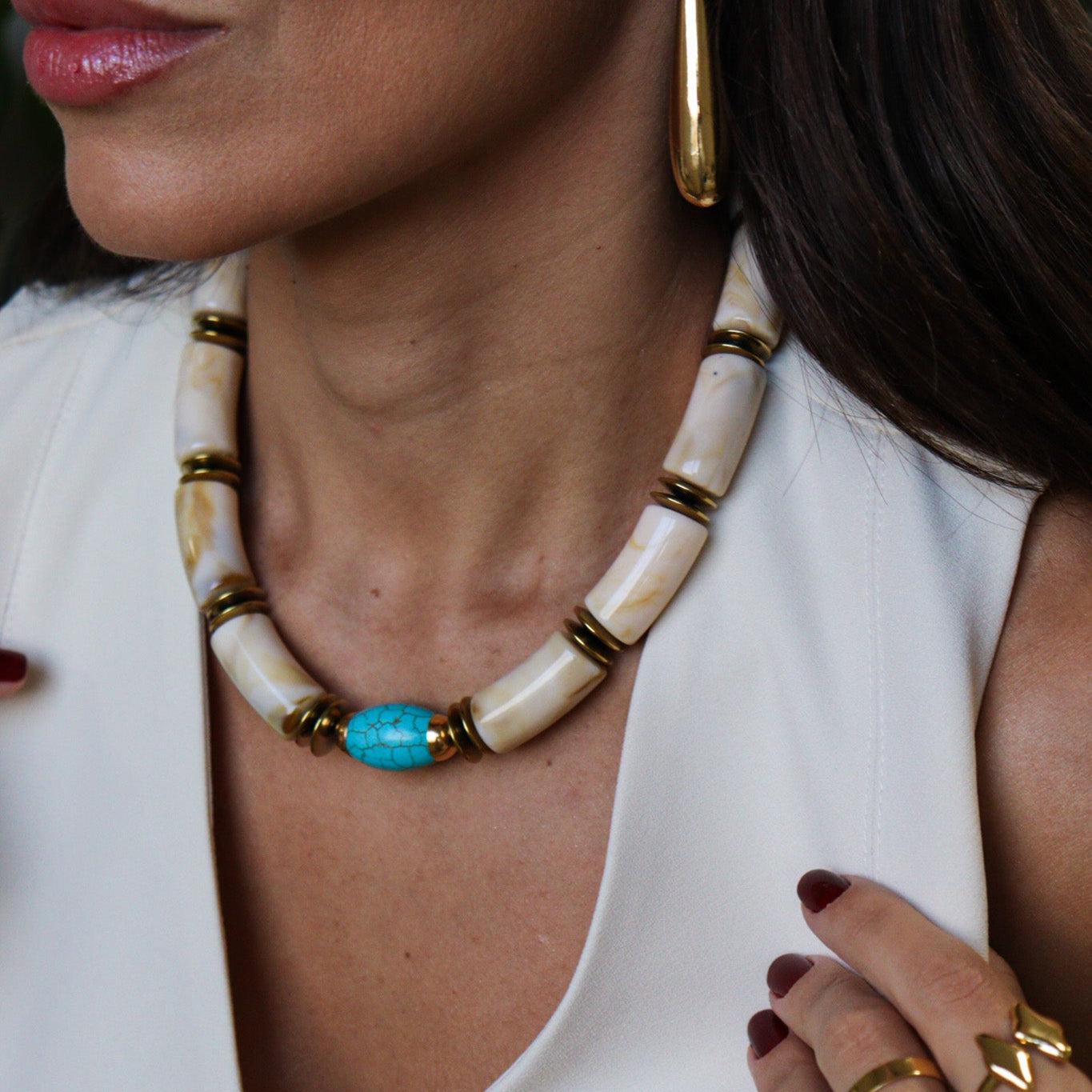 Descrição: colar cristais em tom creme, discos em dourado e pedra alongada turquesa