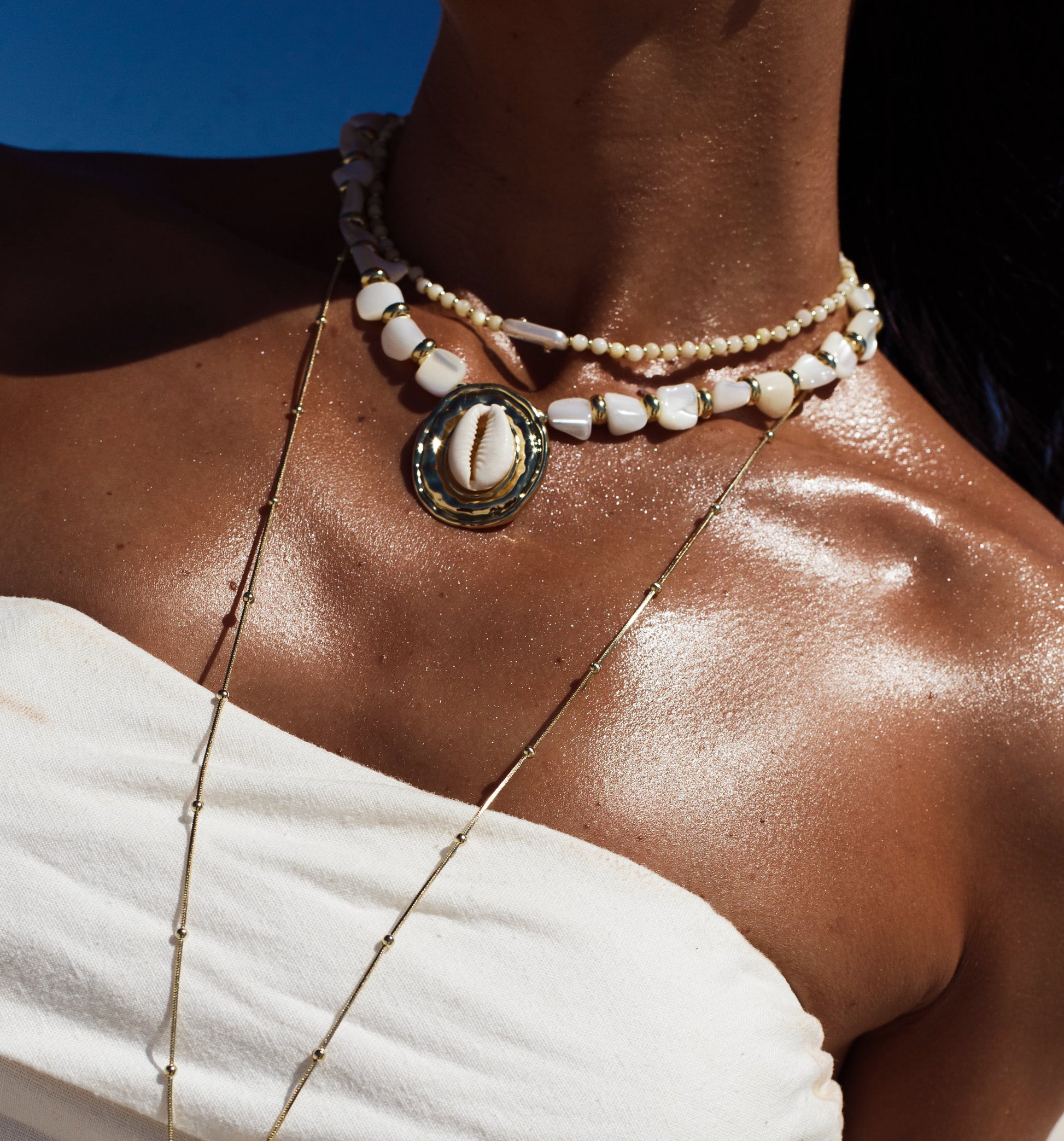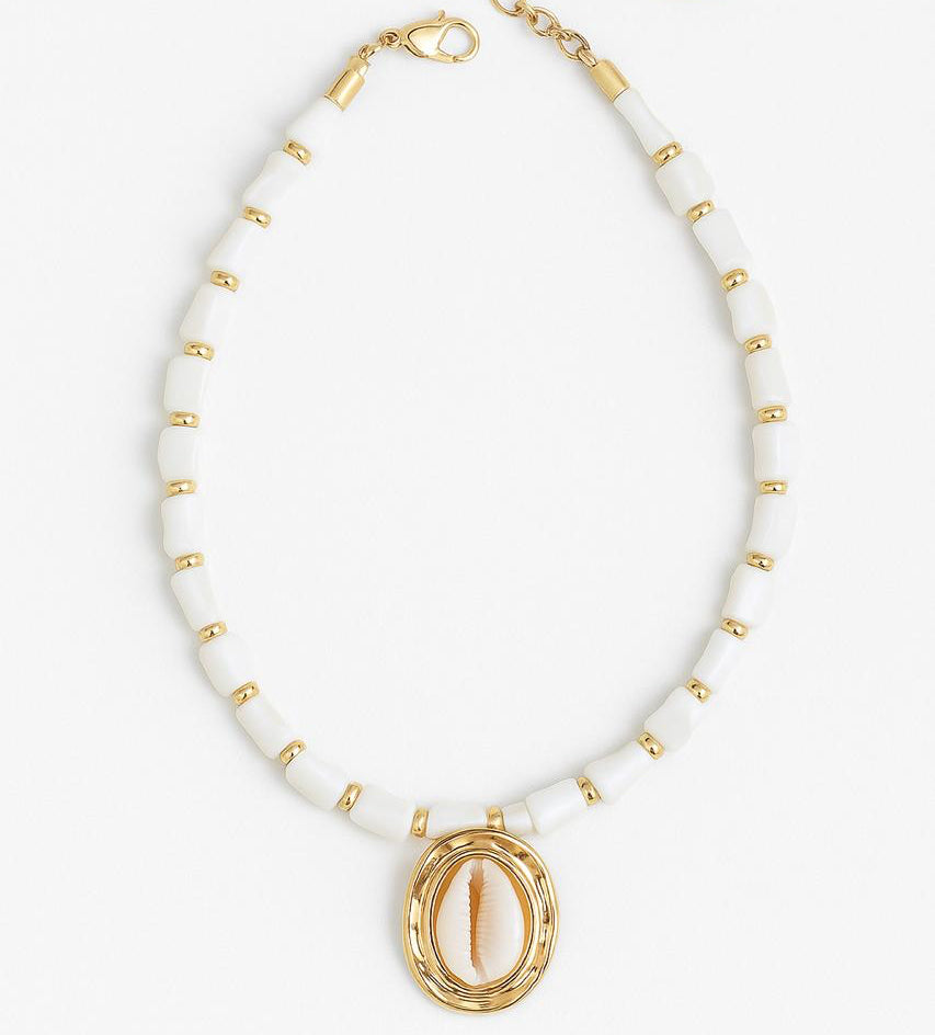 Colar de Pedra Natural Perolada com Pingente Dourado com Búzio