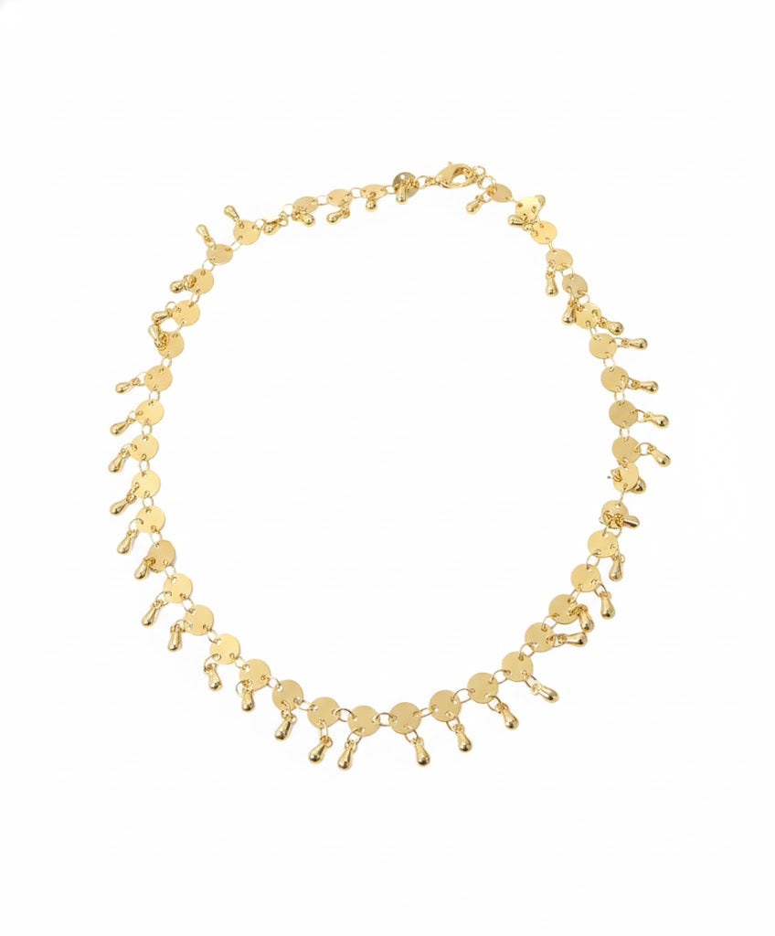 O colar dourado de detalhes metálicos é a tradução da luz em movimento — cada plaquinha espelhada reflete o brilho com suavidade, criando um efeito vibrante que ilumina o colo sem esforço.