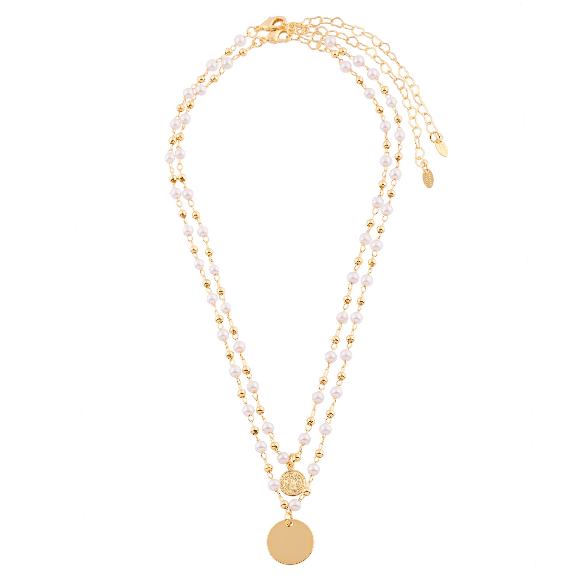 Descrição: Colar duplo com corrente de pérolas e esferas, pingente de medalha lisa maior e medalha de São Bento menor