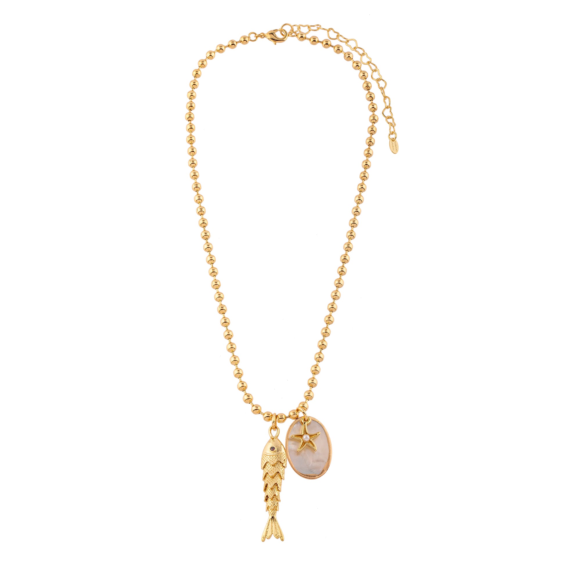 Descrição: Colar de esferas com pingente em formato de peixe e escama madrepérola