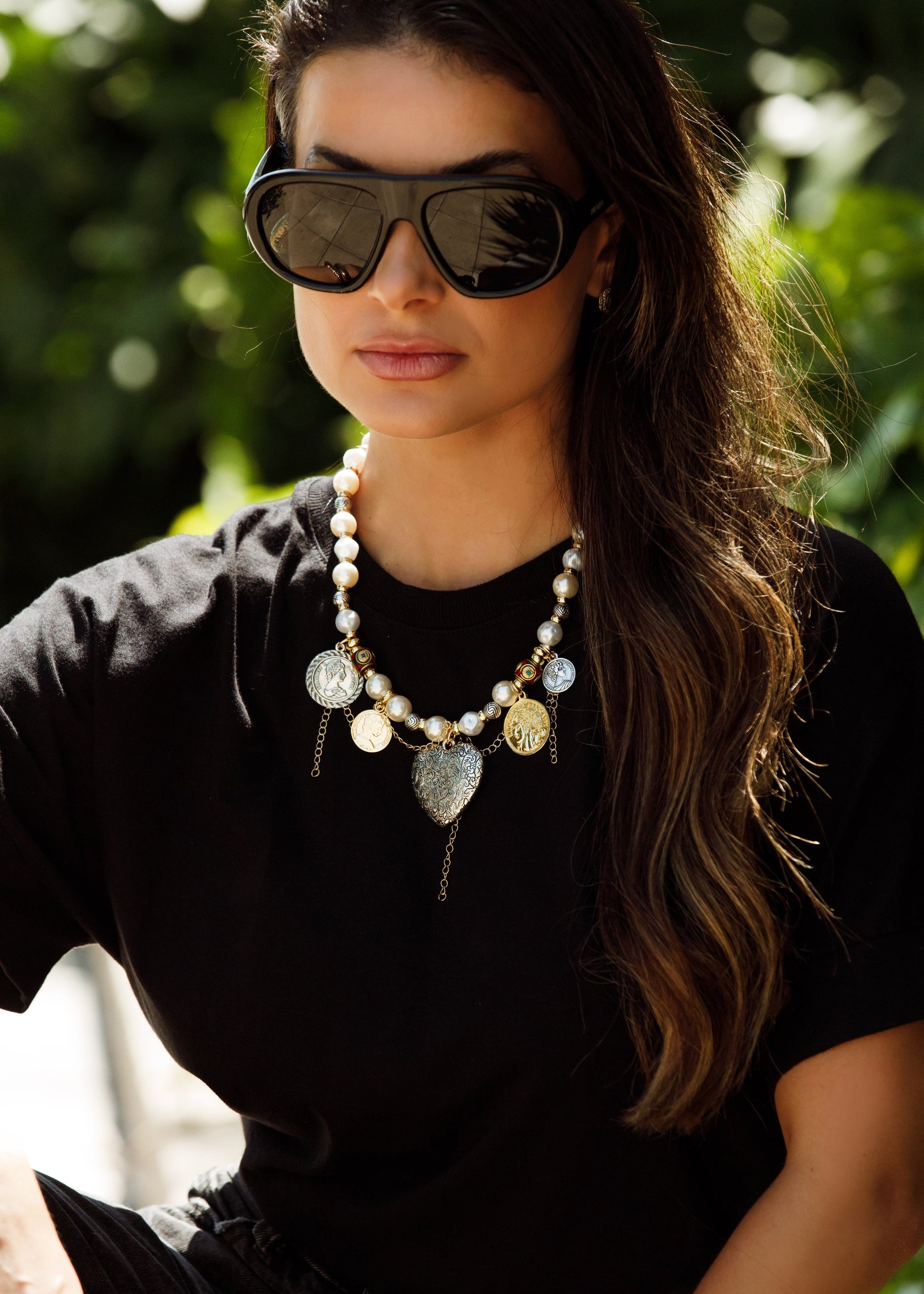 Colar composto por pérolas intercaladas com medalhas e pingentes metálicos, criando um visual marcante e cheio de personalidade. A combinação de elementos traz uma estética sofisticada e contemporânea, ideal para composições que valorizam o acessório como peça principal.