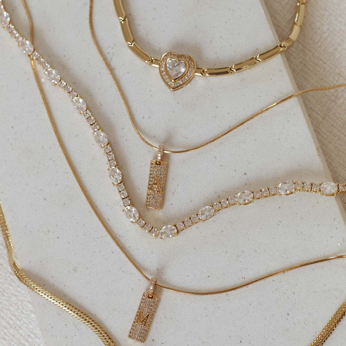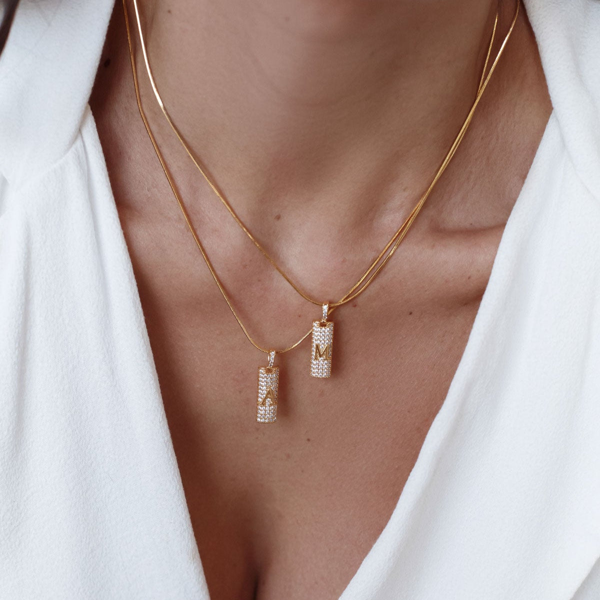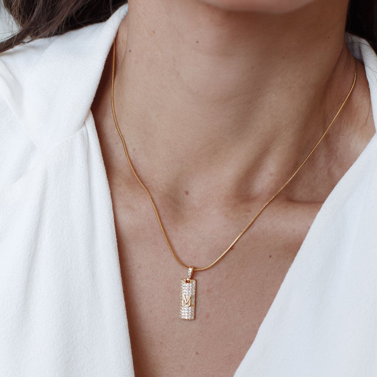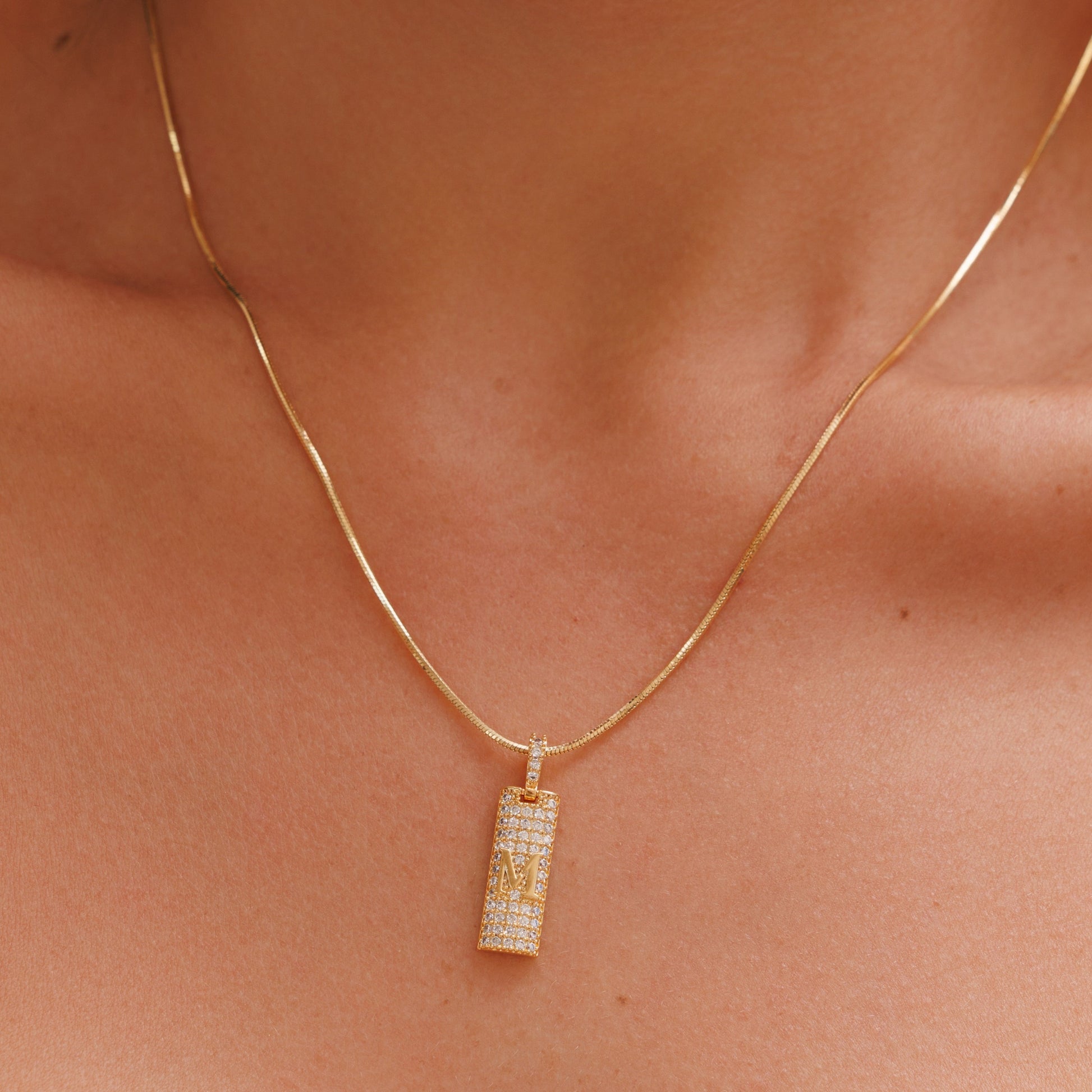 Descrição: Colar de corrente diamantada e pingente retangular cravejado em zircônia cristal com letra lisa.