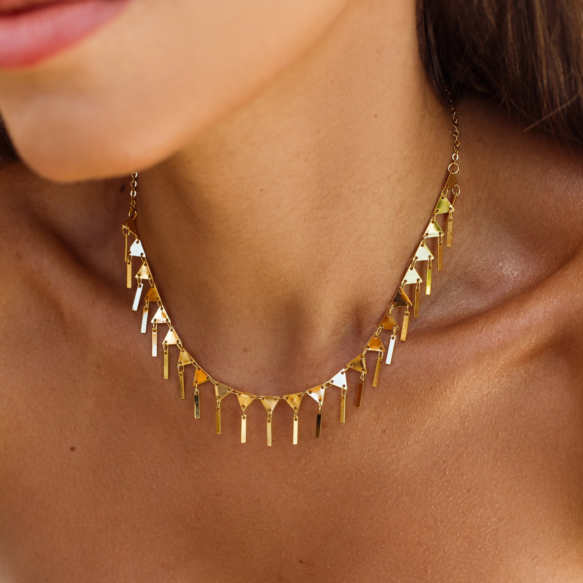Descrição: Colar corrente lisa com triângulos e retângulos pendurados.