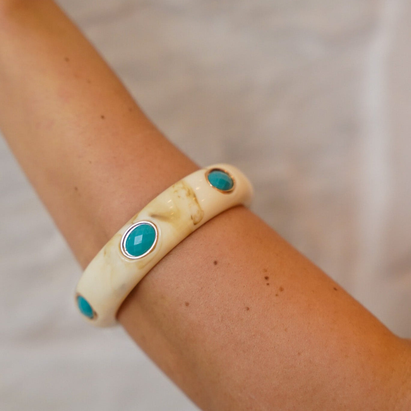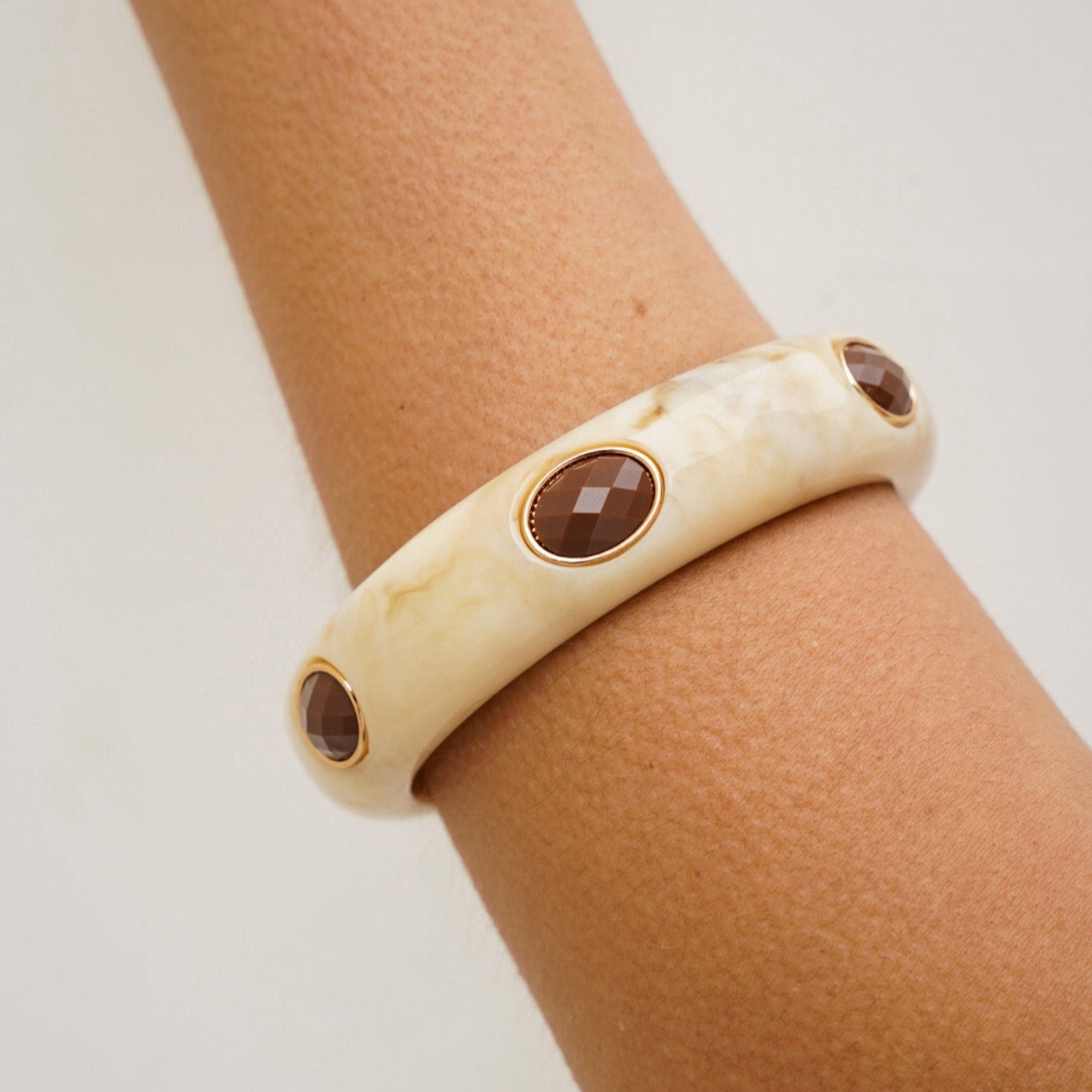 Descrição: Bracelete em resina creme com aplicação de cristais marrom/turquesa